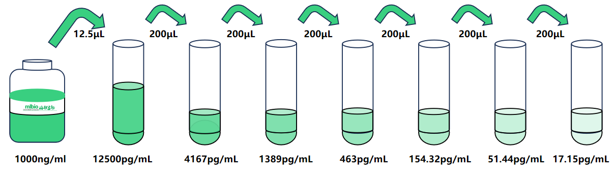 試劑盒中取出標(biāo)準(zhǔn)品,準(zhǔn)備7個(gè)試管,先將1000ng/mL標(biāo)準(zhǔn)品(200µL)按需吸取一定量用1×稀釋液稀釋至12500pg/mL(例:12.5µL的標(biāo)準(zhǔn)品母液+987.5µL的1×稀釋液,制備得到1000μL的12500pg/mL濃度標(biāo)準(zhǔn)品),隨后在6個(gè)試管中分別加入400μL的1×稀釋液,在這6個(gè)單獨(dú)的試管中將12500pg/mL標(biāo)準(zhǔn)品依次3倍倍比稀釋至7個(gè)梯度,共配制7個(gè)濃度的標(biāo)準(zhǔn)品,依次為:12500pg/mL、4167pg/mL、1389pg/mL、463pg/mL、154.32pg/mL、51.44pg/mL、17.15pg/mL,從最高濃度標(biāo)準(zhǔn)品溶液中吸取200μL標(biāo)準(zhǔn)品到下一個(gè)試管中,輕輕吹打混勻,以此類推進(jìn)行標(biāo)準(zhǔn)品的倍比稀釋(如圖所示),1×稀釋液用作零濃度標(biāo)準(zhǔn)品(0pg/mL)。