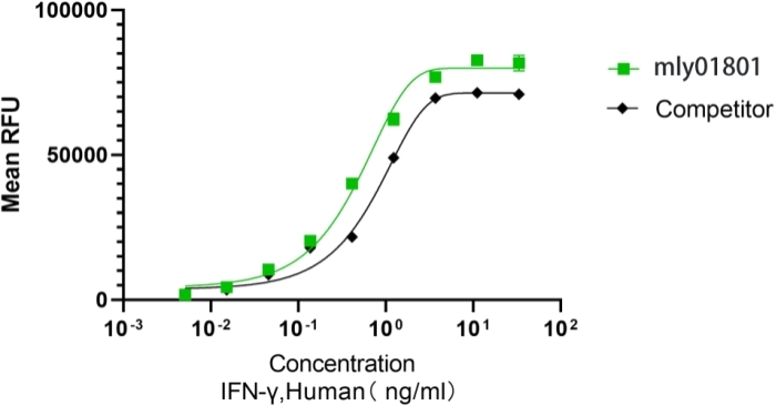 Recombinant  Human IFNγ  (Cat. No. mly01801)  stimulates proliferation   of   Mo7e   cells.   The   ED50      for   this   effect is ≤2 ng/mL. The activity of mly01801 was higher than the other competing product.